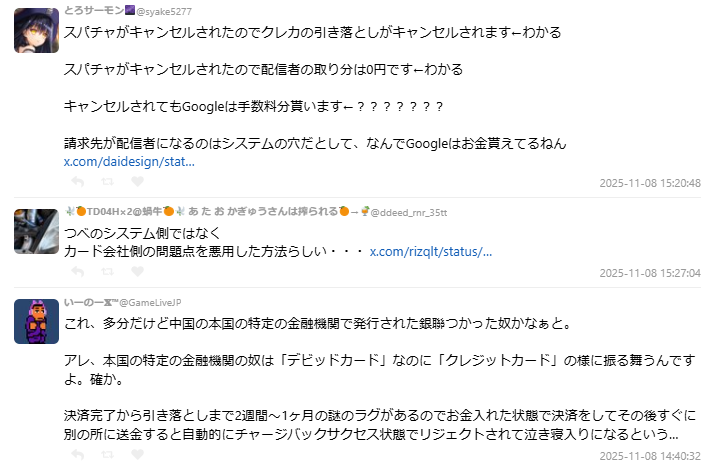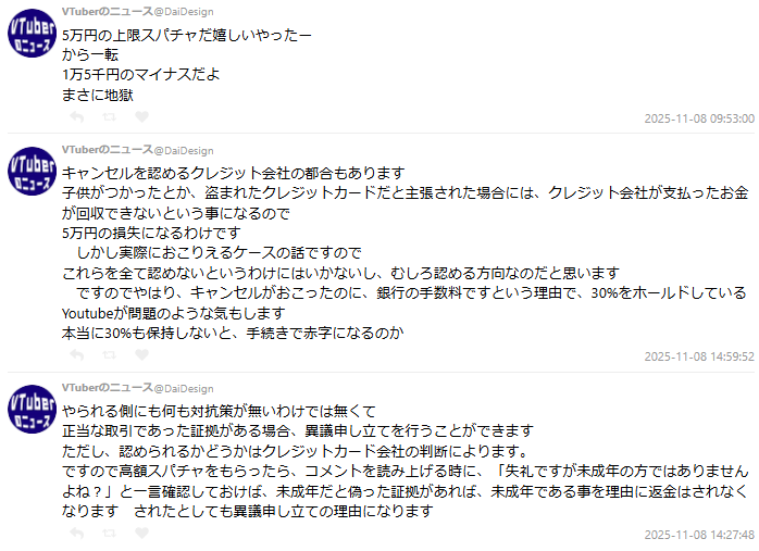 許多 VTuber 都表示,這情況根本防不勝防。有受害者指出,出事的帳號多半是「海外帳號」或「可疑的新帳號」,短時間內送出數百筆贈禮或 Super Chat,之後就被信用卡公司以「被盜刷」「未成年付款」等理由要求退款。