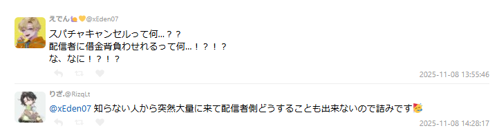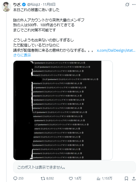 VTuberりざ.(@RizqLt)就在 X 上崩潰表示:「今天我遇到這種情況。突然有外國帳號送了一堆會員贈禮,結果被取消後,費用全算在我身上……我這個月不但沒賺錢,還倒貼開台費用。而且幾乎完全沒有對策辦法,只能莫名要支付這些費用。」
