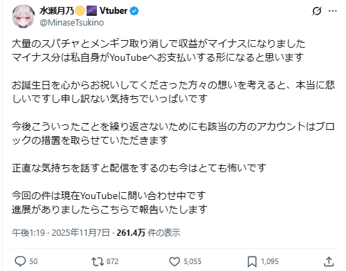 另一位 VTuber「水瀬月乃」也說,她的生日直播中收到的大量贈禮和超級留言被取消後,整個頻道的收益變成負數:「想起那些真心幫我慶生的粉絲,就覺得超難過也很抱歉……坦白說,現在連再開直播都覺得很害怕。」