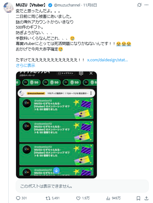 同樣遭殃的 VTuber「MUZU」則怒喊:「我就覺得怪怪的!兩天前被外國帳號送了 500 份禮物,防不勝防!這對專職 VTuber 來說根本是生死問題啊!」