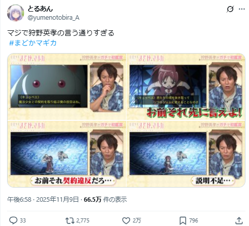 於今日(11/9)播出時,當狩野英孝聽到少女們與丘比契約內容的真相時,立刻對丘比吐槽:「你這傢伙怎麼不早講啦!」還直言「我真的討厭你~」。這樣的評語也火速在日本X上掀起話題。