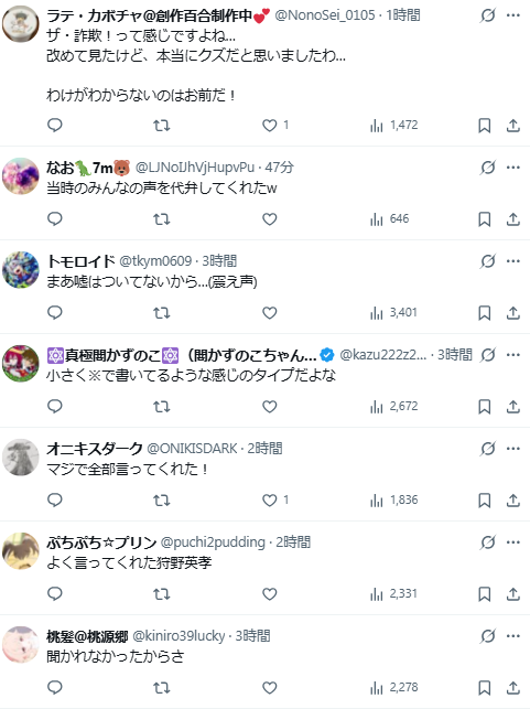 不過日本網友普遍對狩野英孝的副聲音講評給予好評,認為他很認真看還會帶入感情,很喜歡這種跟著劇情會有起伏的反應,甚至還講出了許多大家當時想講的話 www。