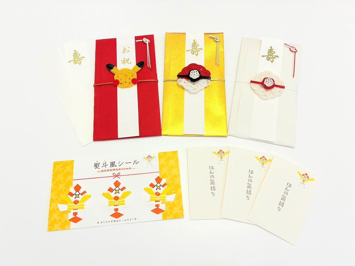 這次的紅包袋系列共有三款,分別以皮卡丘、精靈球、以及紀念球為靈感,搭配日本傳統風格的「水引」裝飾,質感超講究。除此之外,還有以紙御劍為主題設計的「日式賀禮貼紙」,能貼在禮物包裝上,增添滿滿祝福氛圍。