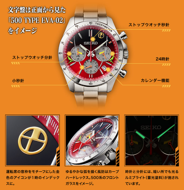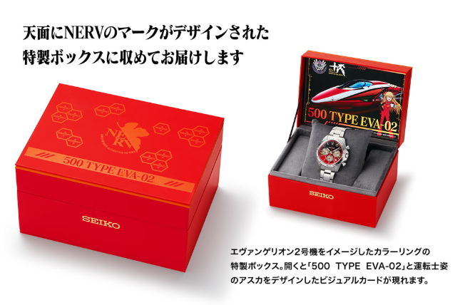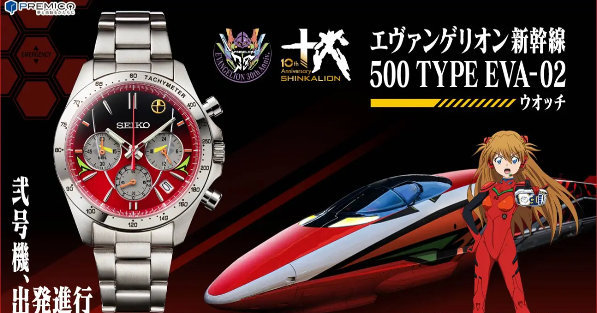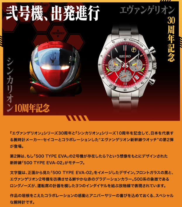 近日宣布與逢動畫30周年的《新世紀福音戰士》合作,推出以跨界車型「500 TYPE EVA-02」二號機新幹線為主題的手錶,以紀念《新幹線變形機器人》系列10週年。售價為59,400日圓,全球限量5,000副。