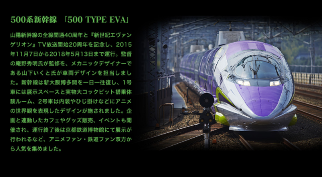 當時 2015 年《新世紀福音戰士》 迎接電視動畫版播出 20 週年,事逢日本山陽新幹線開業 40 周年,攜手推出了「新幹線:新世紀福音戰士計畫」,設計了 「500 TYPE EVA」列車,以初號機的色系為發想,不僅車體外觀經過精細打造,內裏的 1 號車廂更有放置插入栓駕駛座,車廂內更是打造屬於福音戰士世界觀的內裝設計,相信不少福音戰士粉絲當時都有朝聖的衝動。