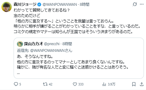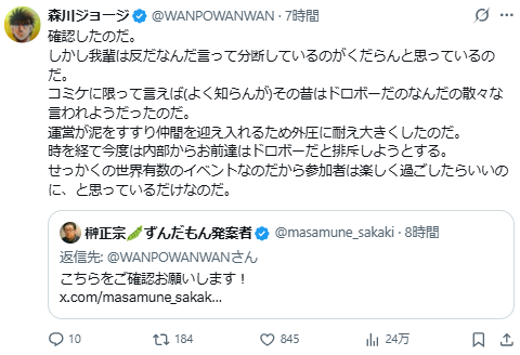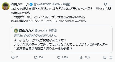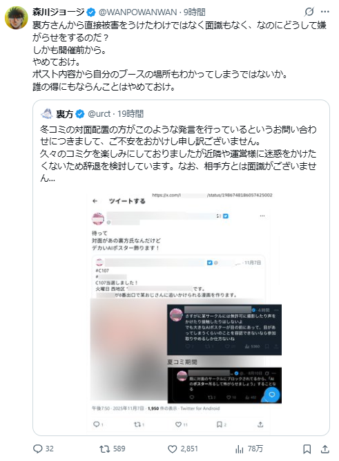 不過近期在日本X上,有許多參加者,因AI使用問題引發的爭議,討論AI作品到底是否應該能擺攤進場,甚至在社群上不少人去審視其他攤位作品是否為AI。然而以《第一神拳》聞名的漫畫家森川讓次,罕見的對這種情況表達了不滿與勸誡。