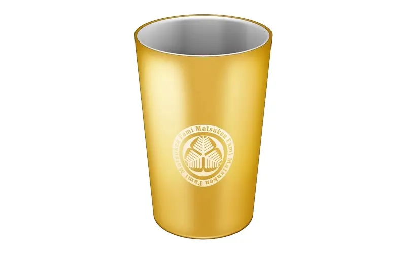 「松平健不鏽鋼隨行杯」以奢華的金色杯身為主題,上面印有「MATSUKEN」名字與家紋徽章。容量450ml,具備保冷與保溫功能,不管是冰咖啡還是熱茶都能維持在理想溫度。
