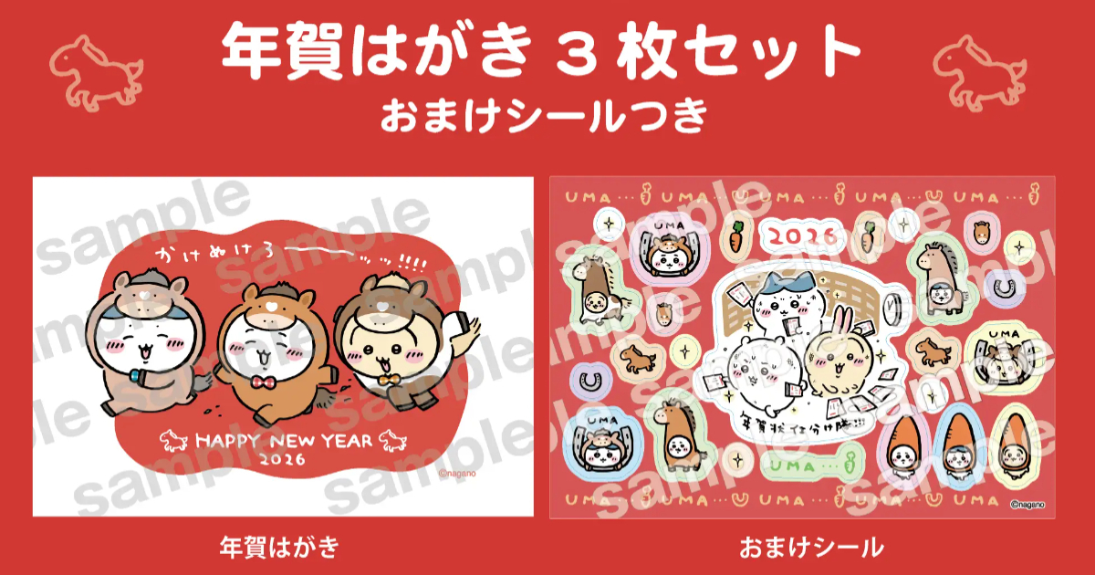 今日宣布將與近來超高人氣,插畫漫畫家ナガノ( NAGANO ) 的作品《吉伊卡哇 ちいかわ》合作,將推出「年賀明信片3枚組&貼紙組」,響應馬年繪製特別主題。將於 2025年11月14日起,在全日本約200家郵局門市同步開賣,也會在「郵局網路商店」開放線上預購。