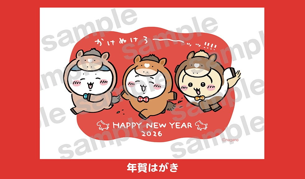 這款年賀明信片組以 2026年的生肖「馬」 為主題,設計中可以看到變身成小馬、開心奔跑的吉伊、小八和兔兔們,整套共有三張相同圖案的年賀明信片。