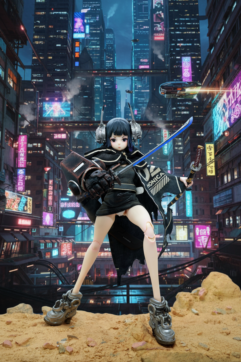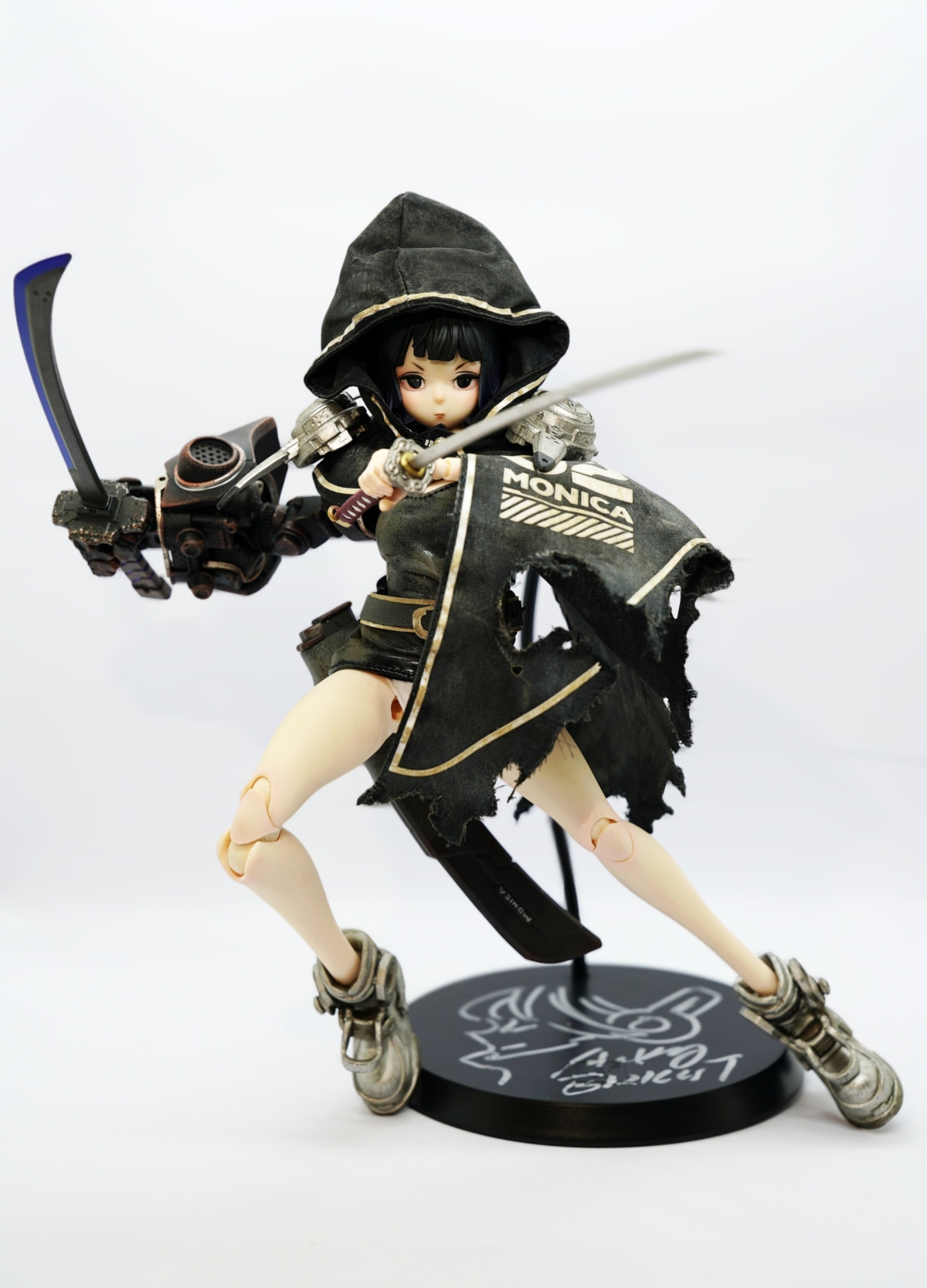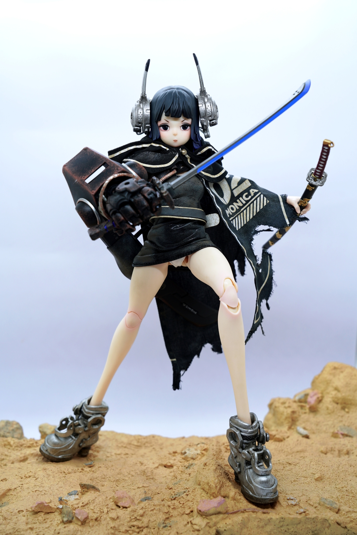 有幸於上海 2025 Wonder Festival 向原創設計師 Acky Bright 朝聖,入手了 BC 的 Monica!主體連耳機高度約 28cm。配件主要包括磁吸耳機,兩把專屬大刀,台座,一隻放鬆手型及披風等。