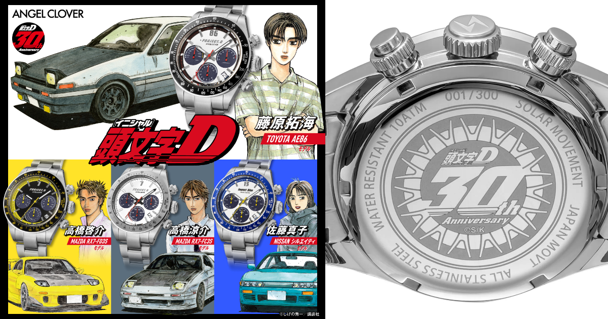 近日宣布與手錶品牌 ANGEL CLOVER 合作運動錶款,這次推出以劇中經典車款為靈感的聯名手錶。包括主角藤原拓海駕駛的「AE86」在內,共有4款設計。售價為36,300日圓,現已開放預購。