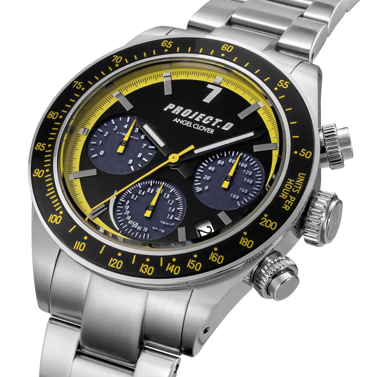 以拓海的勁敵高橋啓介所駕駛的「MAZDA RX-7 FD3S」為靈感,這款錶的外觀自然少不了亮眼的黃色元素。錶盤外圈、指針與刻度皆以黃色點綴,讓人一眼聯想到夜間山道中閃耀的「黃色彗星」。