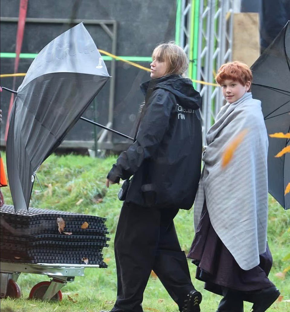 片場照還首次曝光了飾演胡奇夫人的露易絲·布瑞莉(Louise Brealey),她曾在《新世紀福爾摩斯》(Sherlock)中亮相,這次則以巫師風格的防水運動外套登場,與當年佐伊·沃納梅克(Zoë Wanamaker)在電影中的深色巫師長袍造型差異明顯。可以看出,影集似乎試圖保留角色核心輪廓,但重新塑造服裝風格,以符合現代影集的視覺語言。