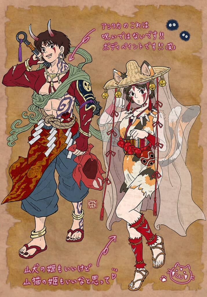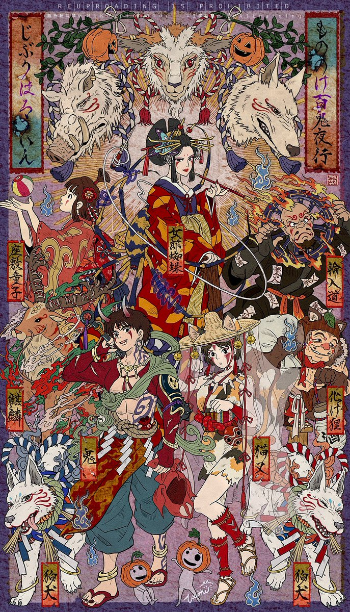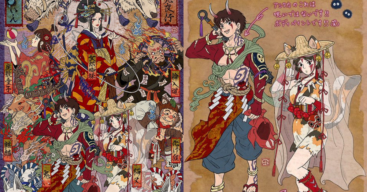 在畫中,《魔法公主》裡的角色們——像是 阿席達卡、小桑、黑帽大人等人——都換上了「妖怪或神靈的萬聖節裝扮」。