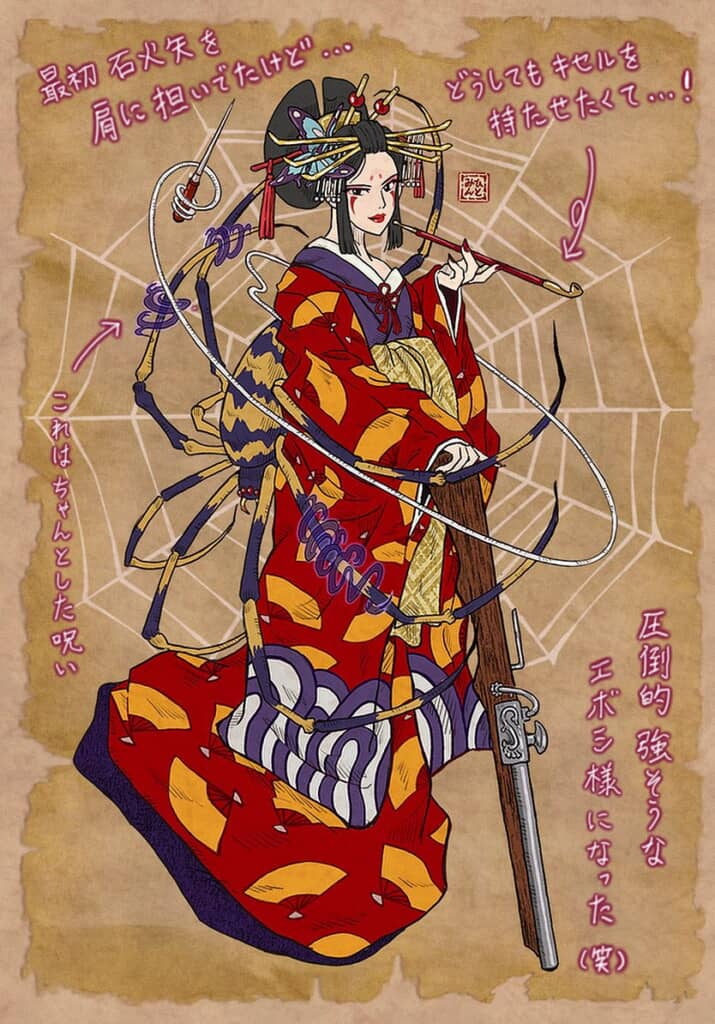▼ 黑帽大人化身成「女郎蜘蛛」,站在畫中央,用銳利的眼神直視觀者,一手拿著火槍、一手叼著煙斗,氣場超強。