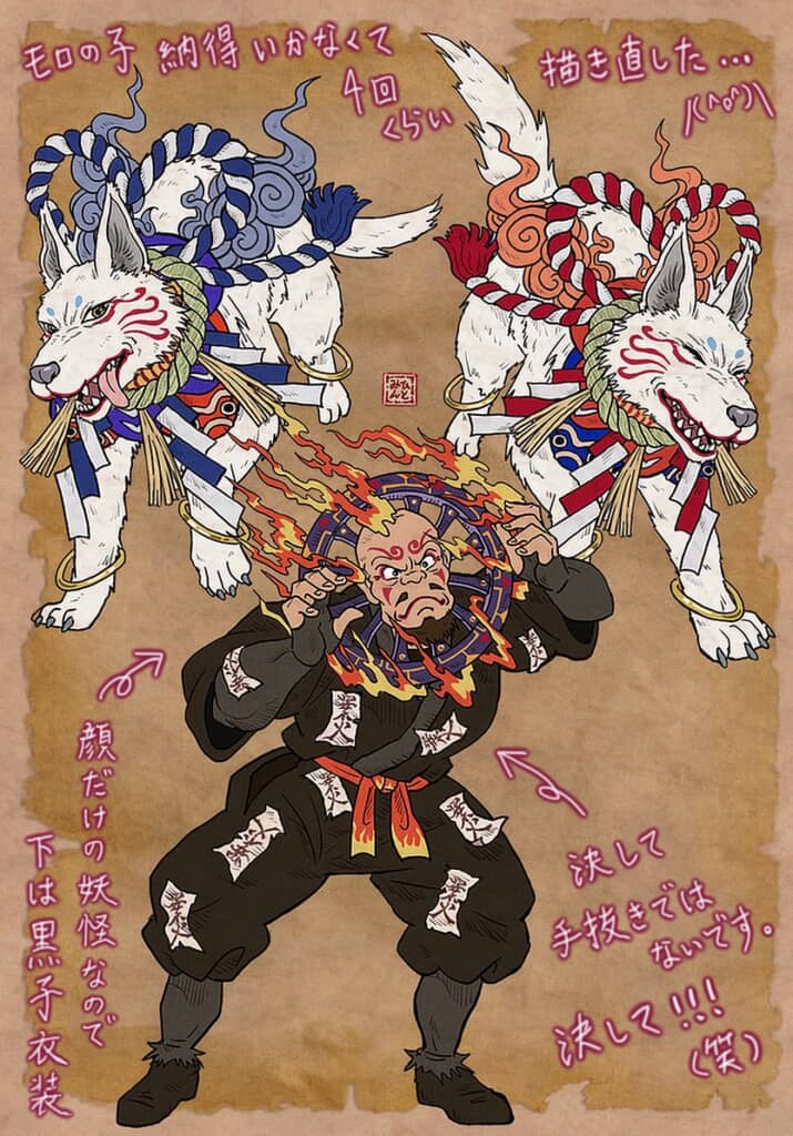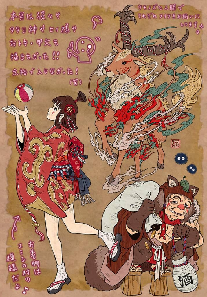 除此之外,還有打扮成「輸入商」的權三、「狛犬」造型的犬神莫娜的孩子們、「化狸」版的疙瘩和尚、「麒麟」版的亞克路,以及穿著「蝦夷村圖樣和服」的卡雅——整幅畫細節滿滿、創意爆棚,看不膩。