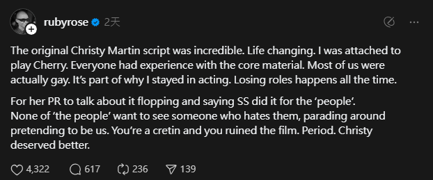 隨著電影票房受挫,爭議也隨之升溫,其中《蝙蝠女俠》(Batwoman)露比·蘿絲(Ruby Rose)近日在Threads上公開猛烈批評史威妮,直言她「毀了這部電影」,引發外界熱議。