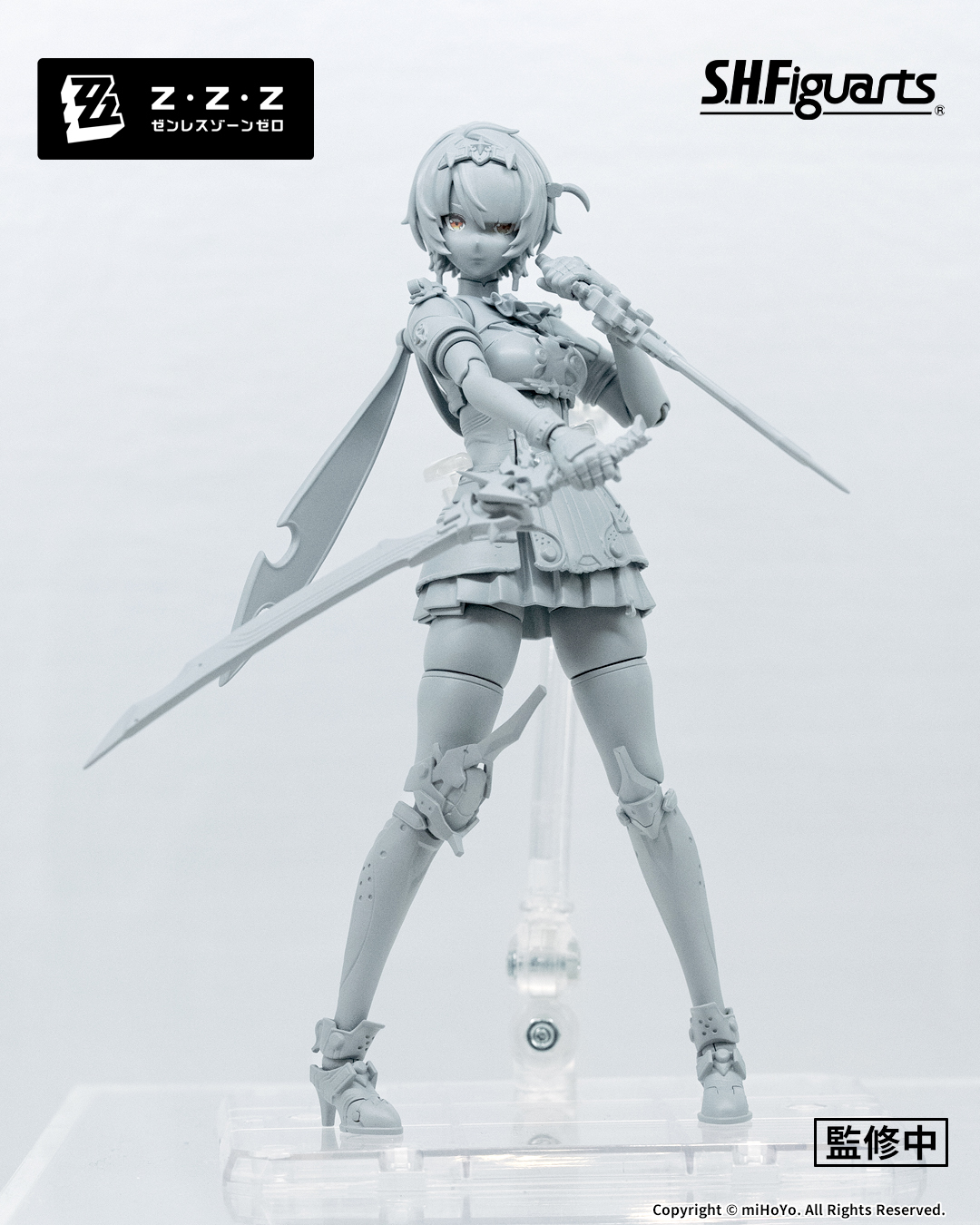 「S.H.Figuarts 零號・ 安比」基於遊戲中再次穿上白銀軍戰衣的姿態立體化,採用全高約 15 公分的可動規格製作。雖說目前只展出未上色的灰模原型,不過全身服裝細節造型相當精密,也重現豐滿的大腿肉等身材曲線。包含身軀、四肢、背部垂掛的布料都能看見可動關節,除了專用的雙刀武器外,也能期待會有哪些表情零件和其他配件。