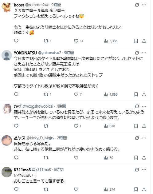 不少網友也讚嘆像藤井比漫畫還誇張的人物,真的是前所未見的無雙角色,藤井現在在將棋界的成就,幾乎超越創作的等級。