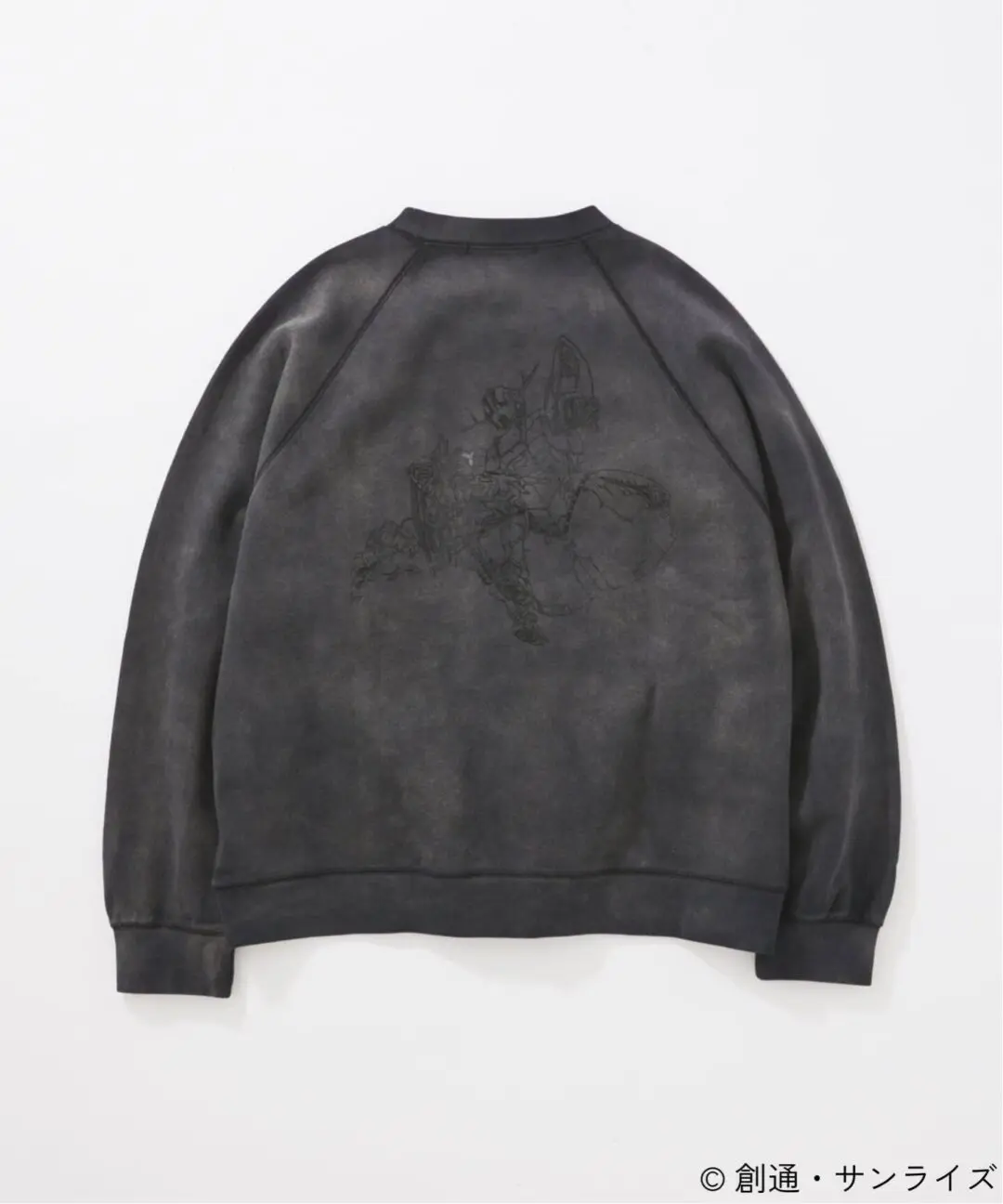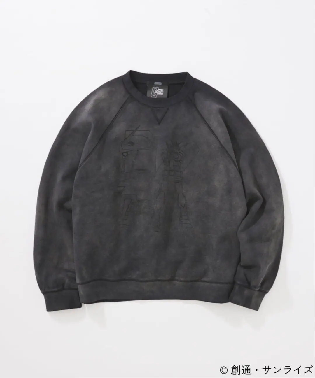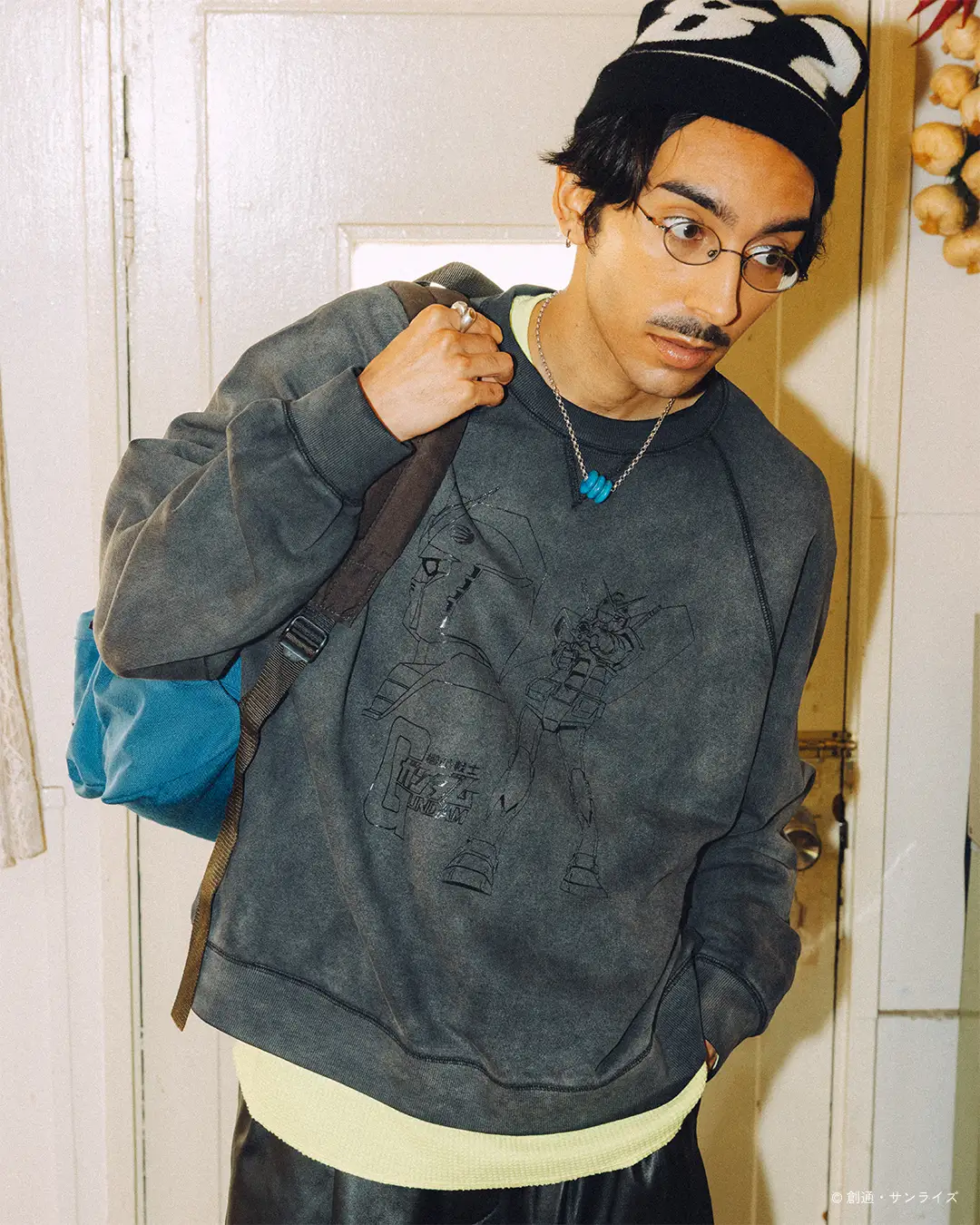 把《機動戰士鋼彈》中代表性的初鋼與吉翁克配置在胸前與背後,整件衣服做了漂白加工,有種霧面、舊化的質感。圖案是使用凝膠印刷,會隨光線呈現微亮、立體的效果。正面鋼彈、背面吉翁——宿命之戰直接穿在身上。