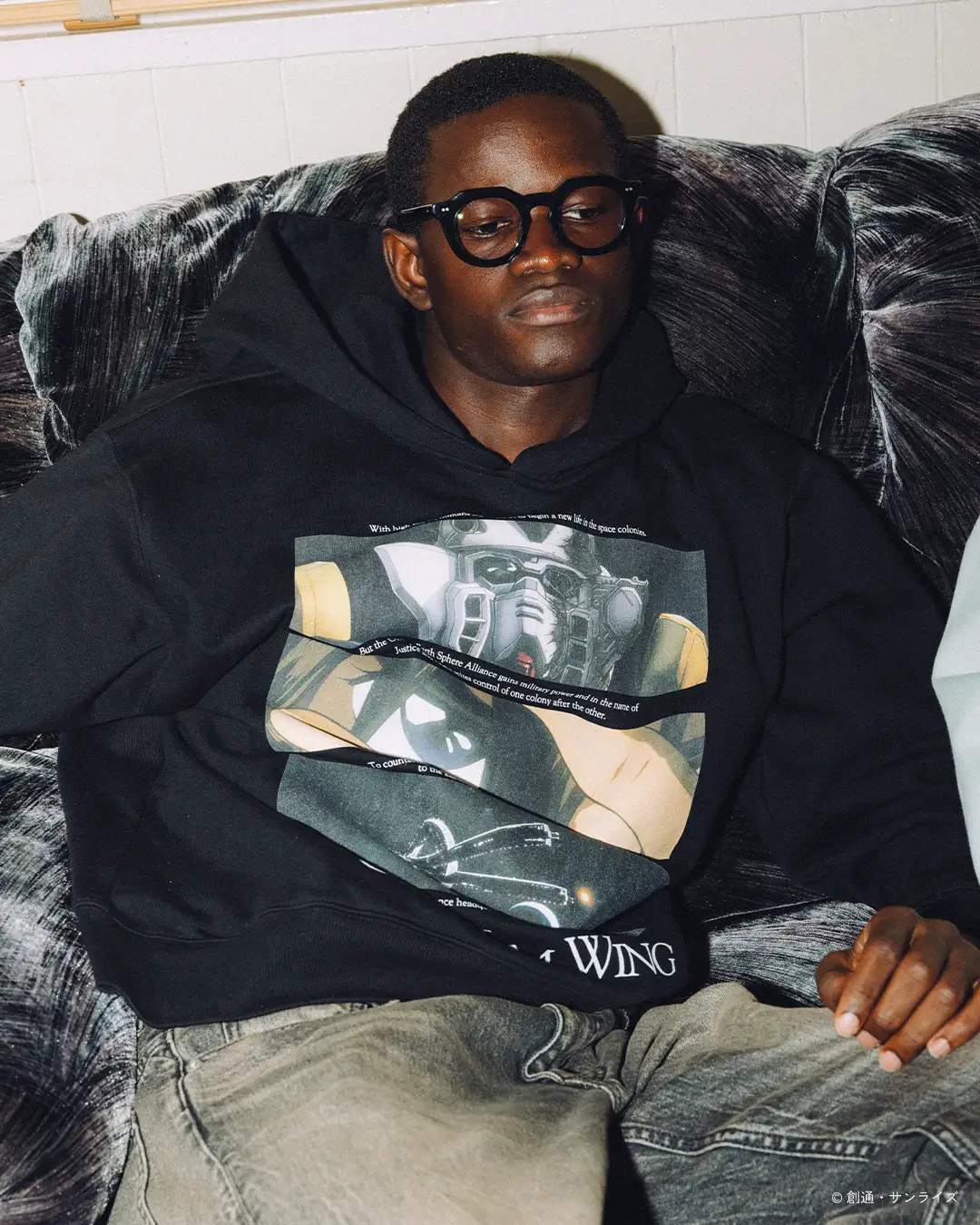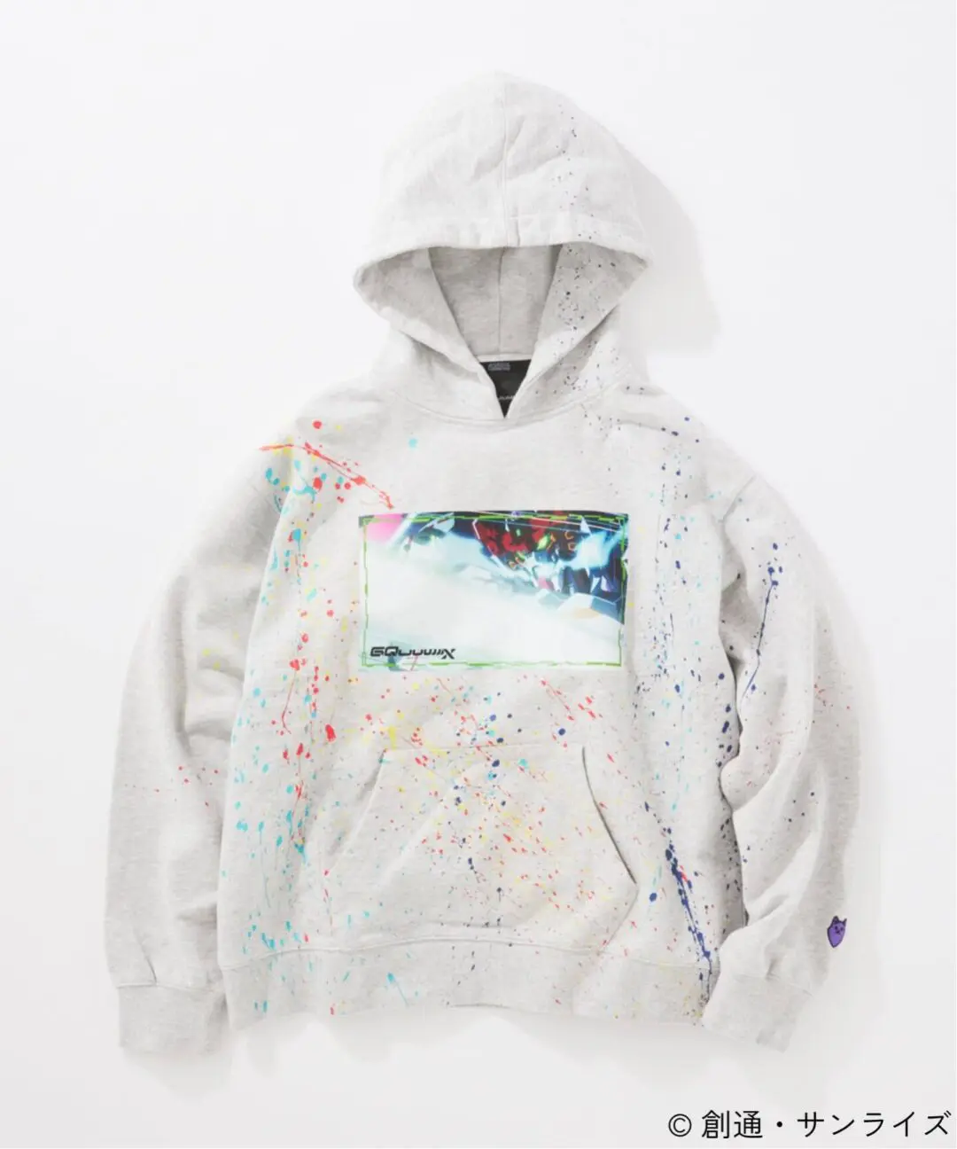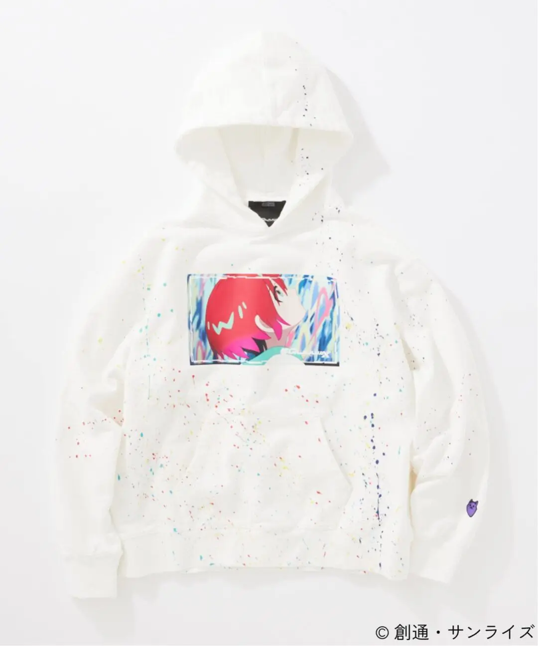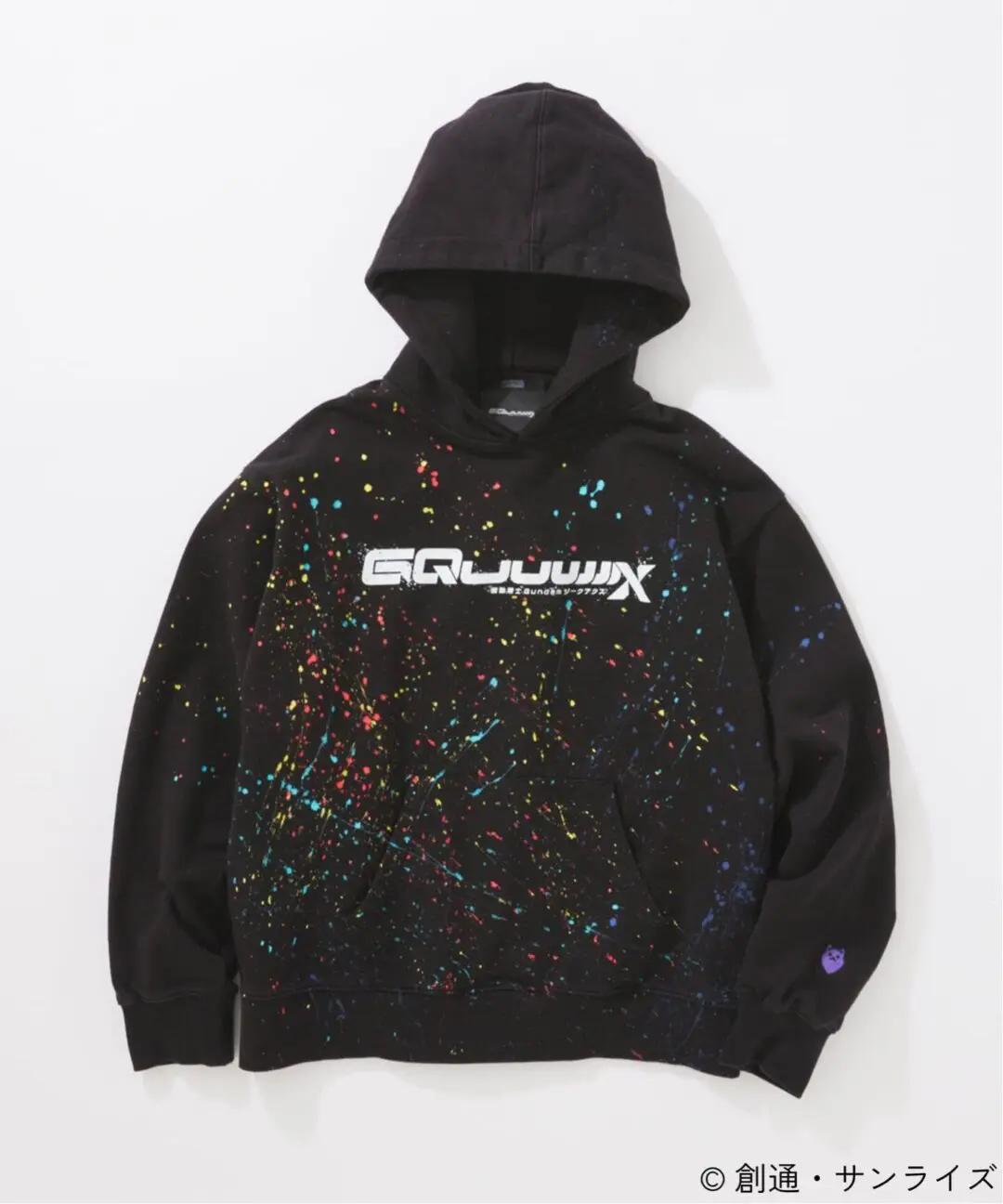 將《GQuuuuuuX》的標題 LOGO 放在胸前,黑色搭配彩色噴濺圖案,呈現動畫裡代表性的「KIRAKIRA」效果。袖口有博美犬軍團的刺繡標誌,是「藝術 × 鋼彈」風格的帽T。