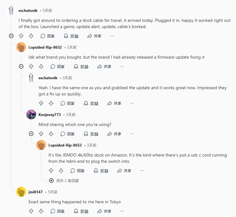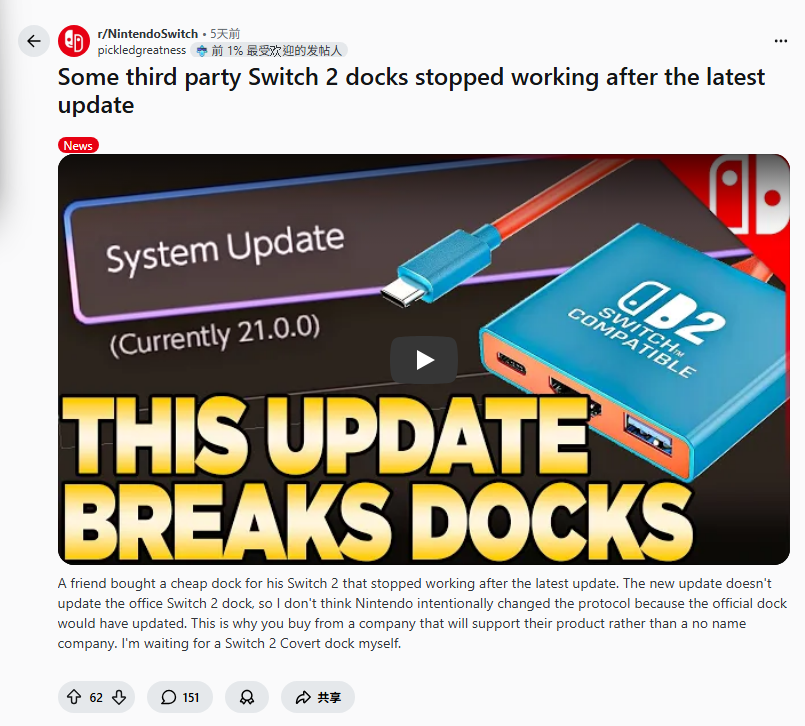 也有玩家指出,家中客廳使用已久的第三方底座在更新後完全不再啟動電視模式,重新插拔、斷電重啟依舊無效,只剩通電充電功能仍能運作。許多家中置放多個底座、方便在不同房間遊玩Switch 2的玩家,也因此受到影響。
