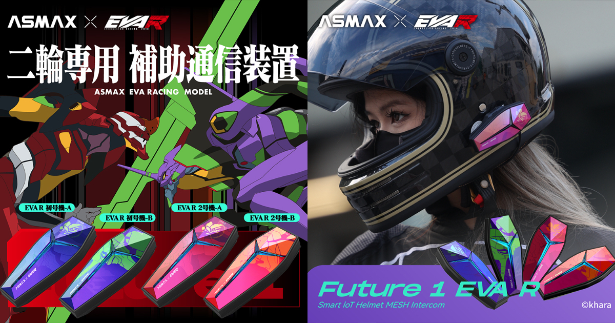 近日宣布與車用品牌ASMAX合作,並以 Khara 旗下的賽車隊伍《EVA-racing》為主題的聯名款智慧型機車用通訊藍牙耳機「EVA R Model」,一口氣推出四款配色,目前可於EVA STORE訂購。
