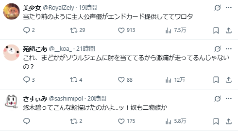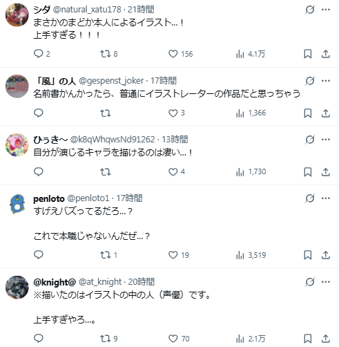 網路上也瞬間炸開,大家紛紛留言:「悠木碧的畫技還是一樣神啦,強到不行」、「主角聲優隨口就交一張 End Card...」、「我知道悠木碧很會畫,但沒想到強到這種程度…太神」、「不署名我還以為是哪位業界插畫師的作品」、「這一定爆紅吧?而且她本業還不是畫畫的耶?」