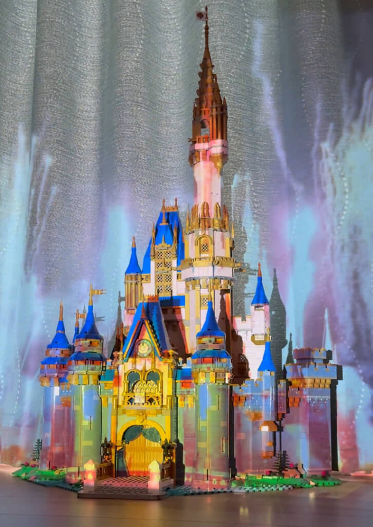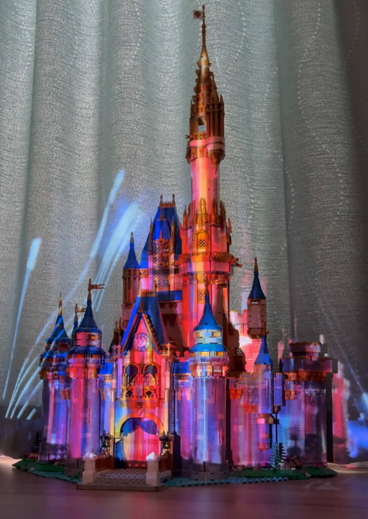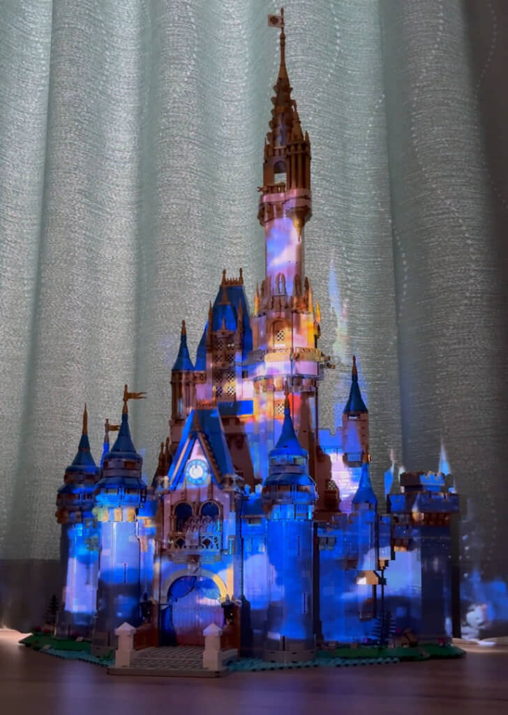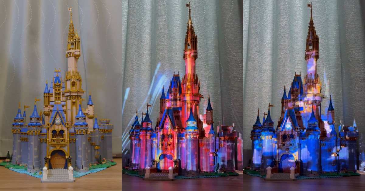 然而,他發布一則影片,影片中他以房間的窗簾當背景,把樂高灰姑娘城堡擺好後,亮起投影畫面——整個投影效果帥到爆,看起來完全就是現場版的迪士尼夜間投影秀「Reach for the Stars」,讓人忍不住驚呼:「居然可以還原樂園現場模樣」
