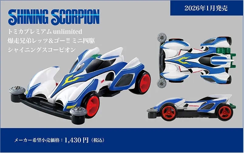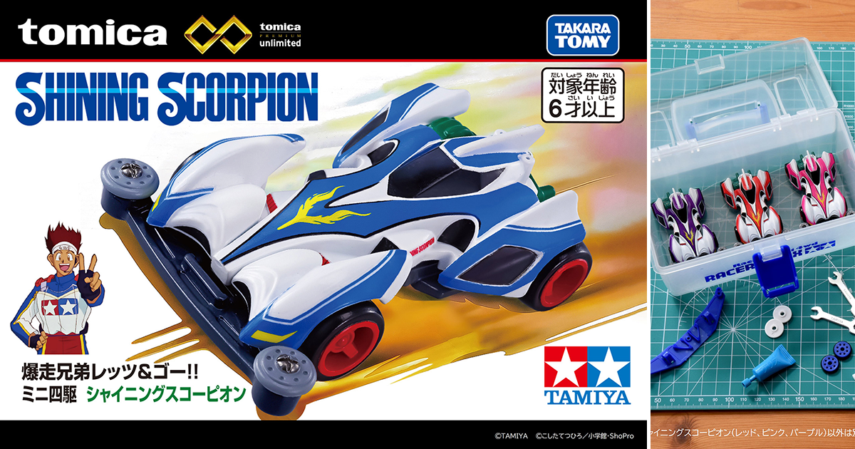 在日本玩具公司 TAKARA TOMY 旗下「多美小汽車」(トミカ/TOMICA)主打讓大人也會興奮的「TOMICA PREMIUM unlimited」系列中,與田宮攜手展開的「迷你四驅車」將在 2026 年 1 月推出那台傳奇的四驅車「閃亮蠍子號」(シャイニングスコーピオン)!更狠的是還有收錄變色版本閃亮蠍子號的「Racer's Box」!建議售價分別為 1,430、6,050 日幣。