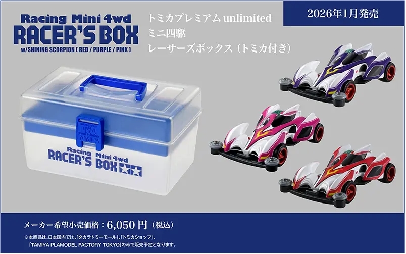 既然提到了會「變色」這個關鍵字,玩具廠商當然不會放過這個機會!同步在明年 1 月發售收錄有紅色、紫色、粉紅色閃亮蠍子號車輛跟收納箱的 Racer's Box(レーサーズボックス)套組。如果你有收藏其它同系列的迷你四驅車也能一起放入,我....我的天!這到底要怎麼忍我就問~