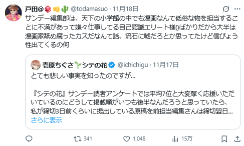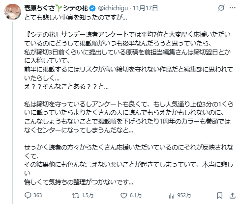 目前於小學館《週刊少年Sunday》連載的漫畫《シテの花-能楽師・葉賀琥太朗の咲き方》作者壱原ちぐさ,近期於自己的 X 上透露作品「刊載順序」相關的狀況,認為自己作品的人氣跟完全沒有反映在待遇上,還有編輯校對沒送、台詞被改、忘記入稿的莫名現象。貼文瞬間引爆討論,吸引不少網友關注這個漫畫界問題。