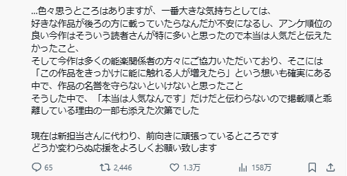 目前,新任負責編輯和自己都已經「往好的方向前進」。雖然前任交接資料不完整,但經過和編輯部的直接溝通,也順利校正了彼此的認知落差。能有機會直接談開,非常感謝。最後,能畫出好作品就是漫畫家能做到的最大誠意,也是最重要的工作。之後也會繼續努力,還請大家多多指教。