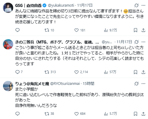 事件引起關注後,許多網友認為這樣對待一位認真的漫畫家實在不行,尤其是編輯應該是讓漫畫家更好做事的協力者,怎麼會搞到扯後腿的情況。尤其小學館也並非第一次跟漫畫家有過這種糾紛,整個矛頭也轉向對於小學館的批評。