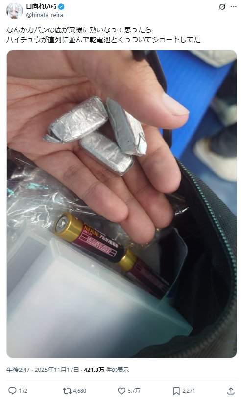 近日在日本X上,有位推主分享了一段驚險又神奇的經歷:她的包包底部突然發熱,結果竟然是——水果軟糖嗨啾(Hi-Chew)跟乾電池在包裡排成一列,直接短路發熱了。他貼出照片後,網友們對此也為之震驚,直呼:「可能真的起火!」,瞬間成為熱議話題。
