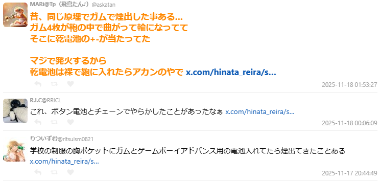 許多網友回報相似經驗:「學生時把口香糖跟電池放制服口袋,結果冒煙。」、「我用鈕扣電池跟項鍊短路過,直接燙到掉。」、「垃圾桶放廢電池+鋁罐,結果真的起火。」,許多人也提醒,不論是乾電池還是鋰電池,如果要帶出去千萬不要裸放散放,確保安全可以放電池盒或用絕緣膠帶貼住正極,以免發生事故。