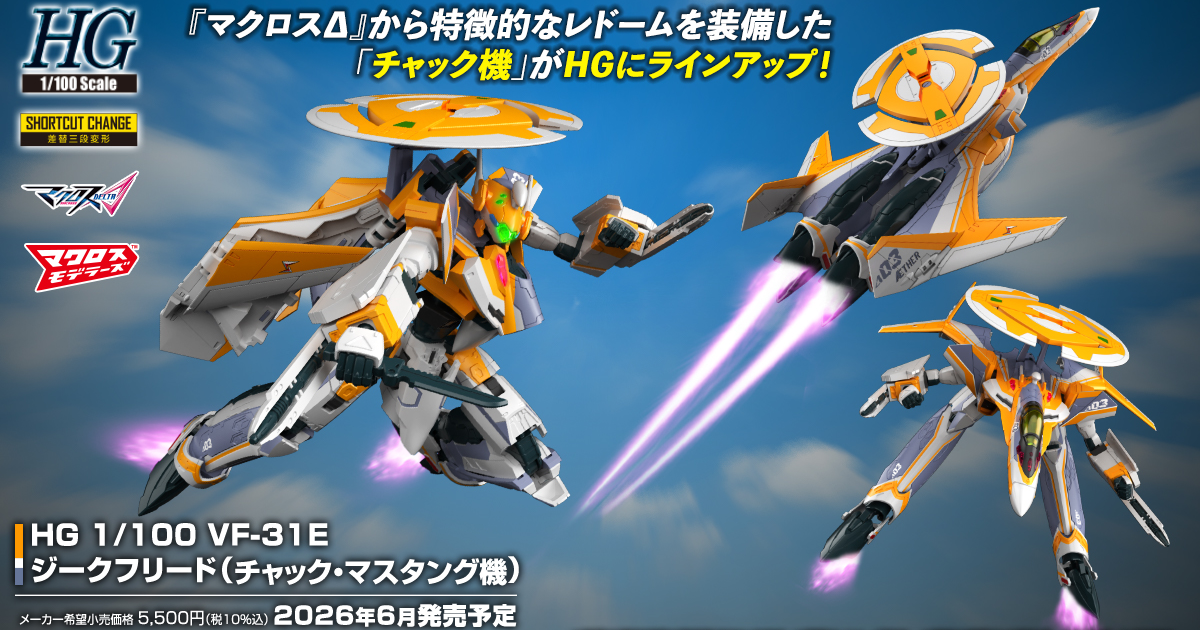 由日本 BANDAI SPIRITS 公司 HOBBY 事業部推出的《超時空要塞》系列『HG(High Grade)1/100 比例』組裝模型,發表了出自《超時空要塞Δ》的最新商品「HG 1/100 VF-31E 英雄式(查克・馬斯坦古機)」預計於 2026 年 06 月發售的消息,此商品將同步推出一般版以及配件更豪華的 DX 版。