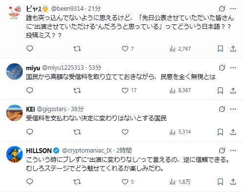 不過今日日媒報導,NHK的媒體總局長山名啓雄召開例行記者會,指出「目前名單內藝人預計會照常演出」,這樣的回應也讓日本網友不滿,認為NHK完全忽視民眾的訴求,在網路上再次引爆怨聲。