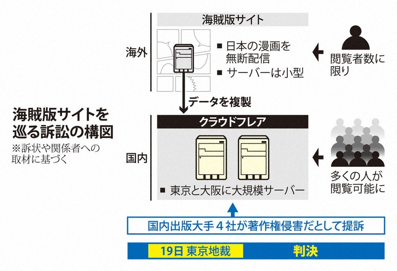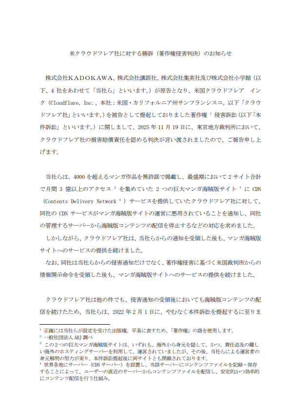 不過這次對象不太一樣,因為美國跨國科技企業Cloudflare 持續替盜版漫畫網站提供 CDN(內容傳遞網路)服務,被認定構成出版權侵害。集英社、小學館、講談社、KADOKAWA 四家大型出版社共同提告美國 Cloudflare,東京地方法院於11月19日裁定Cloudflare必須支付約 5 億日圓的損害賠償。