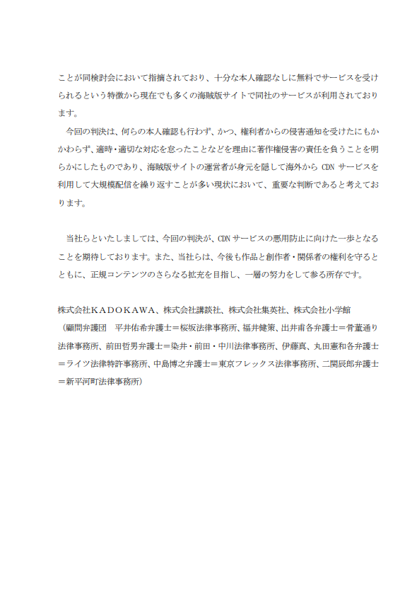 並強調,現在很多盜版網站都利用 CDN 隱藏身分、從海外大量散布內容,因此這次判決非常重要。四社最後表示,希望這能成為防止 CDN 再被濫用的一個重要里程碑,也會持續為版權保護與合法內容推廣努力。