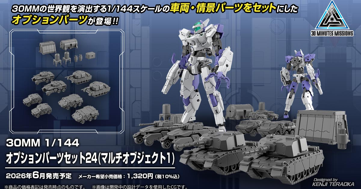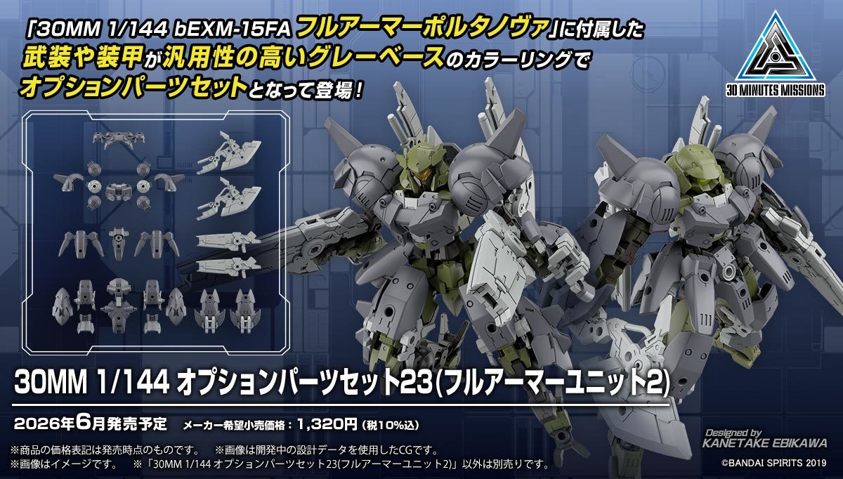 由日本 BANDAI SPIRITS 公司 HOBBY 事業部發行,具備快速組裝、便於改造、量產機魅力的原創組裝模型『30 MINUTES MISSIONS』系列,發表了最新商品「30MM 1/144 配件套組23(全裝甲組件2)」、「30MM 1/144 配件套組24(多功能裝備1)」預計於 2026 年 06 月發售的消息。