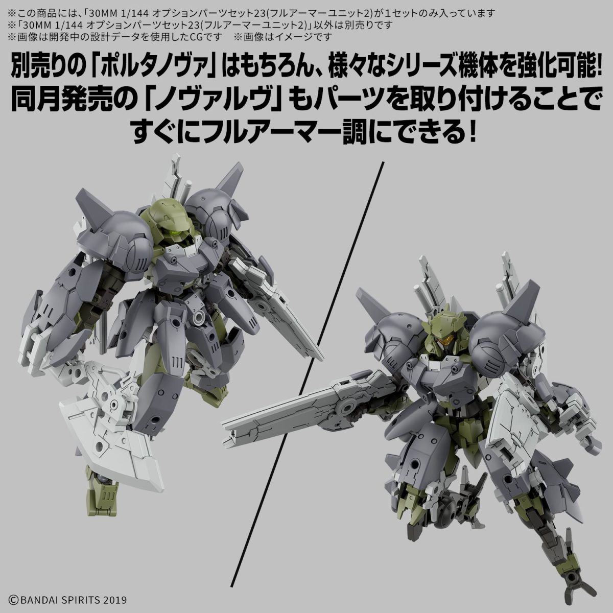 「30MM 1/144 配件套組23(全裝甲組件2)」則是將附在「全裝甲型波塔諾瓦」中的武裝與裝甲零件,替換為灰色成型色單獨推出,內容包含一整套裝甲零件、步槍、戰斧、腕甲與一組轉接零件,能夠搭配『30MM』系列機體自由改裝。