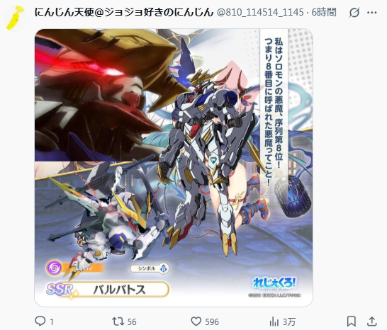 沒想到近日DMM GAMES的美少女手遊《れじぇくろ!》在官方 X公開新角色「バエル」本來照理說應該是紳士們關注的焦點,結果留言區卻整片在討論《機動戰士鋼彈 鐵血孤兒》裡的「主魔鋼彈」,場面完全被鋼彈奪走主角。