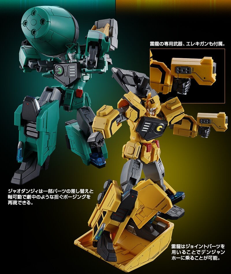 「HG 擊龍神」組裝模型,以新規造型立體再現,運用多色成型零件、透明零件與貼紙,組裝出具備豐富機械造型與色彩的風龍與雷龍兩架勇者機器人,特殊裝備攪拌機與電磁荷台徹底再現。透過專用零件製作的「系統轉換」變形機構,變形為機器人形態與混凝土攪拌車/砂石車的車輛形態!並附有雷龍的專屬武器電磁槍。