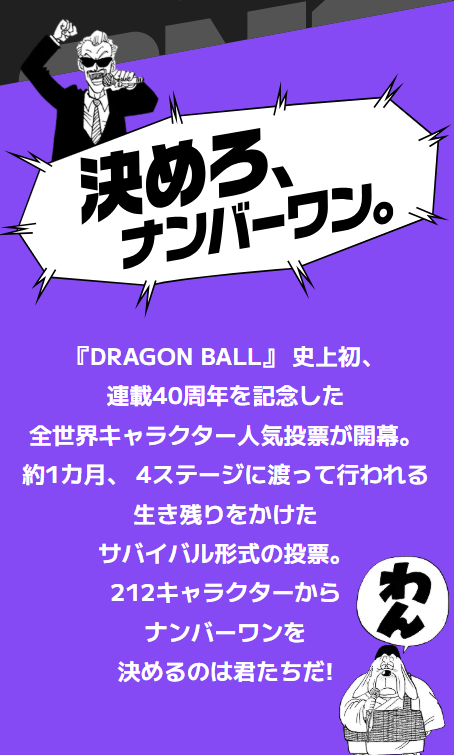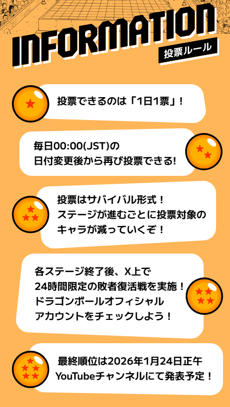 投票對象為漫畫中登場的 212 名角色,全球都能每天在特設網站投 1 次票。最終結果將在 2026 年 1 月 24 日中午,於七龍珠官方 YouTube 頻道的特別節目中公布。