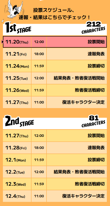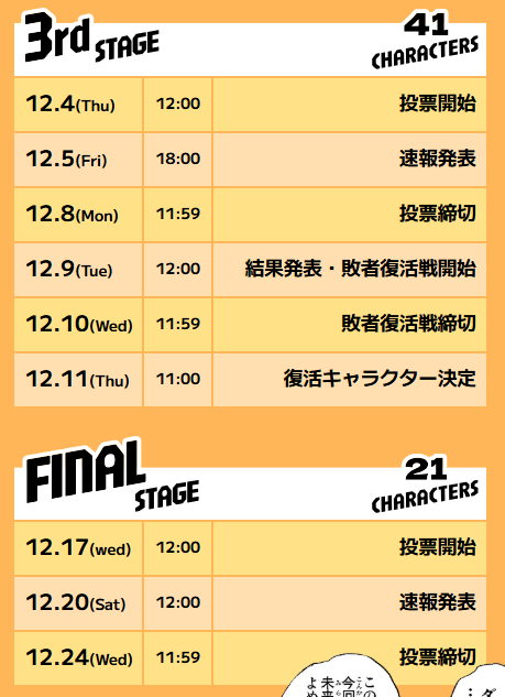 每個階段由票數高的角色晉級,前三階段落敗的角色還能靠 X上的敗者復活戰爭取再一次的機會,最後留下 21 名角色進入 Final Stage,決定最終名次。