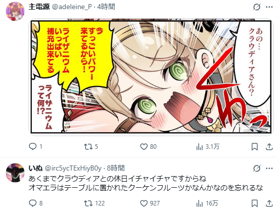 此作品經媒體報導後在X上也掀起討論,有些網友讚賞萊莎跟科洛蒂婭的百合相處,真的有夠香 XD,甚至開玩笑說開始有人要自認是科洛蒂婭了。