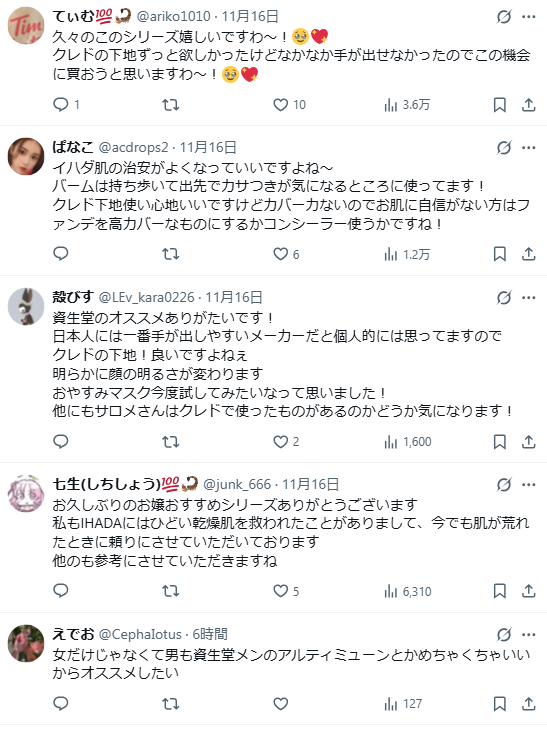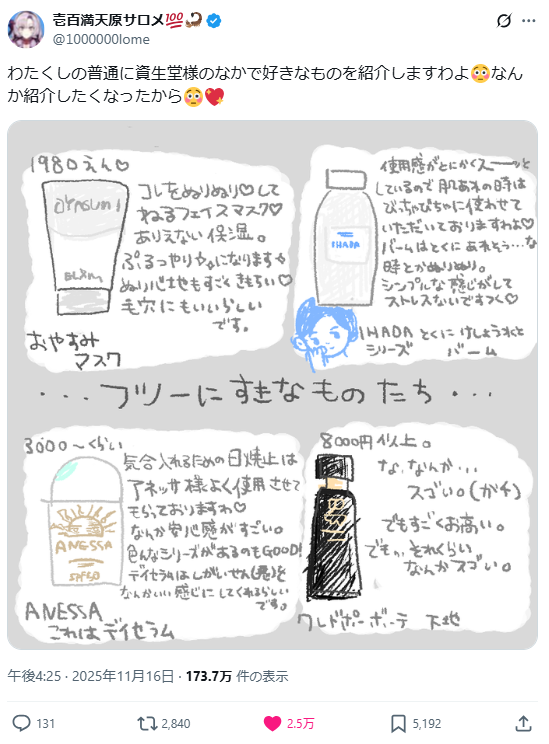 這日本社群這波「支持資生堂」的風潮,壹百滿天原莎樂美在 X上發文表示:「就來介紹一下我平常真的很喜歡的資生堂商品吧,突然就想介紹了。」並一次公開了四款她的自用好物,還以手繪的方式呈現。