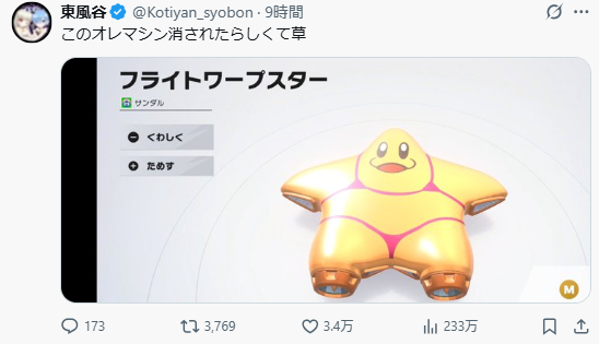 《卡比的馭天飛行者》可是這是睽違22年的續作,主打簡單又爽快的賽車對戰,以及可以把自己做的載具拿去跟大家分享的「我的載具市集」(オレマシン市場)功能,開賣後馬上就引爆話題。開服才一下下,市集就瞬間變成一個大混亂。上面充滿各種玩家惡搞作品——像是長得像寶可夢的機體、或是把星之卡比角色「廚師川崎」弄成迷因化設計的創作也滿天飛。