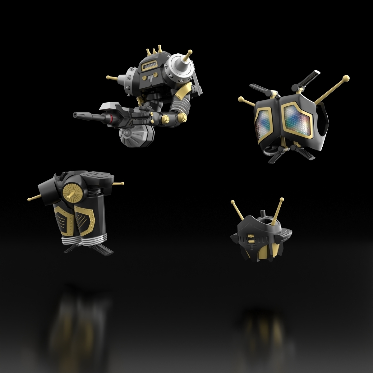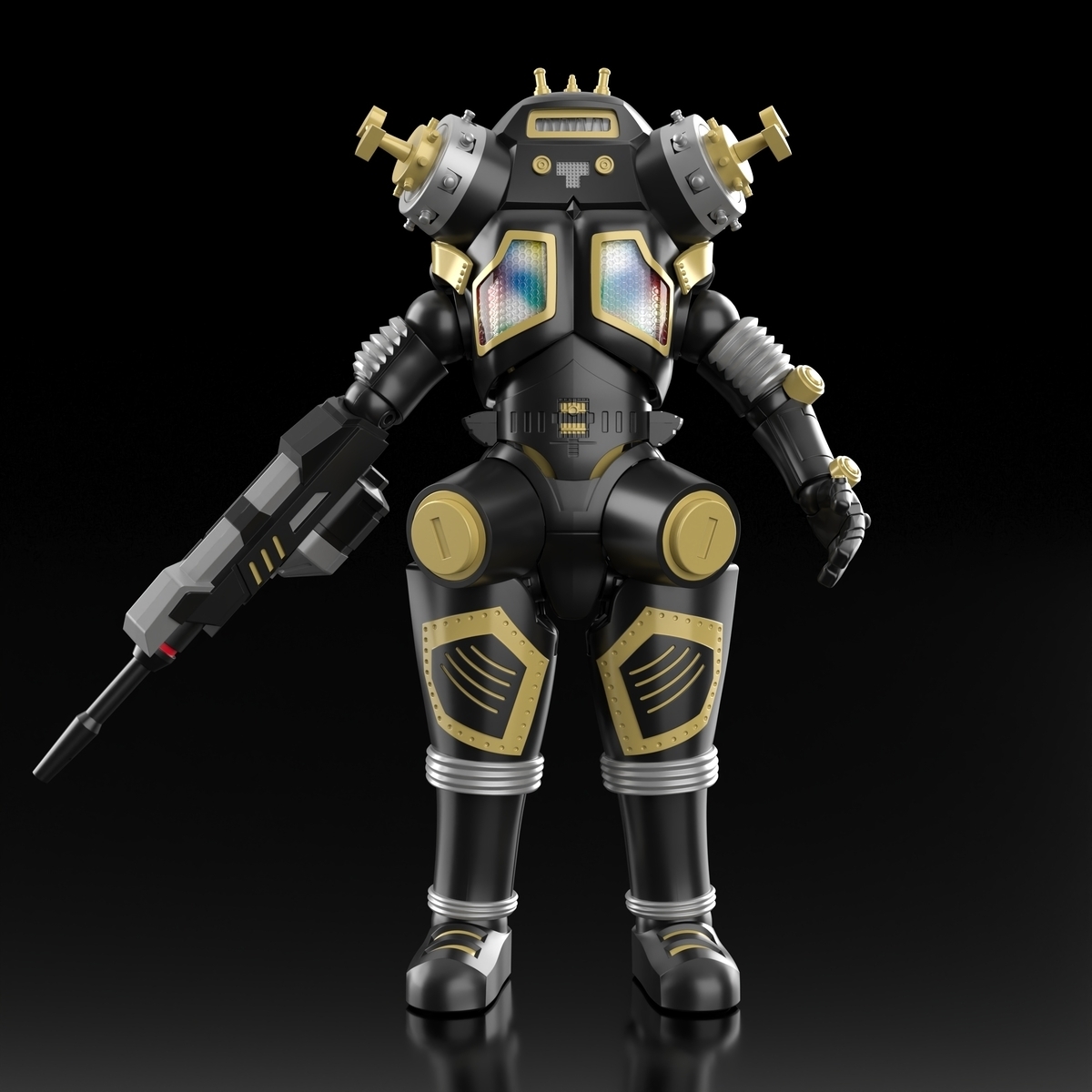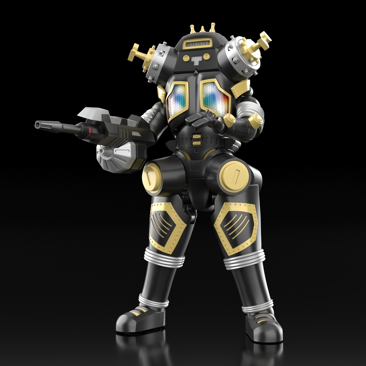 「SMP [SHOKUGAN MODELING PROJECT] 宇宙機器人 金古喬BLACK」,組裝後約高 16 公分,還原在劇中登場的深黑色機身,採用帶有重厚感的黑色、金色與銀色成形色,連膝蓋內側等細小的關節細節都用純色模具把它做出來,並再現右臂標誌性的佩丹尼姆發射器造型,搭配簡單的可動關節設計,可以再現劇中的戰鬥場景!除了重現 4 艘 UFO 組成的變形合體機構,還附有透明支架及佩丹星人飛碟等配件。